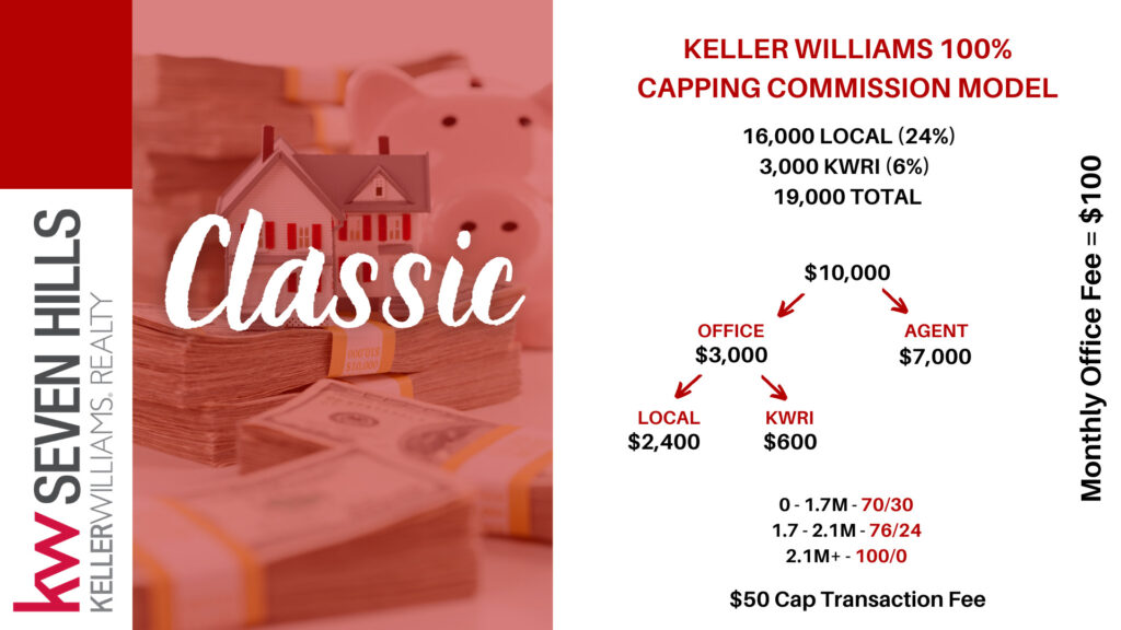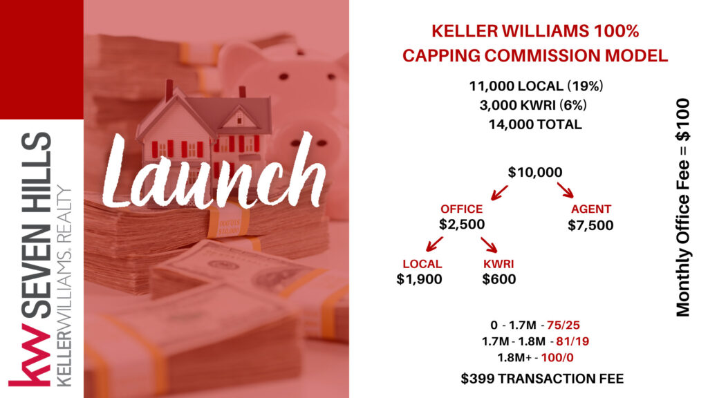 The best part about the Keller Williams commission structure is the ‘cap’. Each office has a cap on commissions based on economic conditions and operating expenses for that specific market center. Also contributing to the cap amount is the average median home price in your area. It usually amounts to selling 8-10 houses per year. Once an agent reaches the set amount of production (cap), they are no longer required to pay the office a split, meaning the agent is at a 100% commission until their anniversary year starts again. How amazing is that?